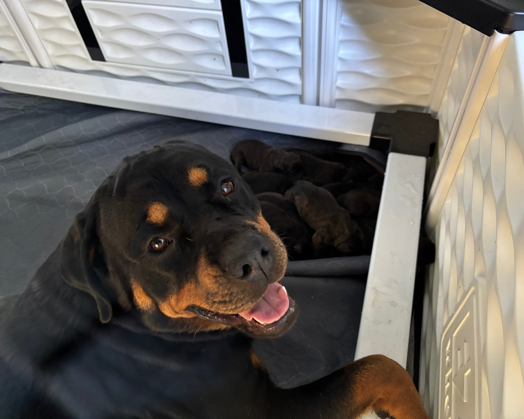 Dam: Iliana is an AKC registered black and tan Rottweiler with amber eyes weighing in at 115 lbs. She is an excellent, attentive mother, and is in perfect health, with a shiny coat and straight, beautiful teeth. She also has a muscular build and a high amount of energy. She is wonderful with children and other animals, and is a remarkable ambassador for the breed.